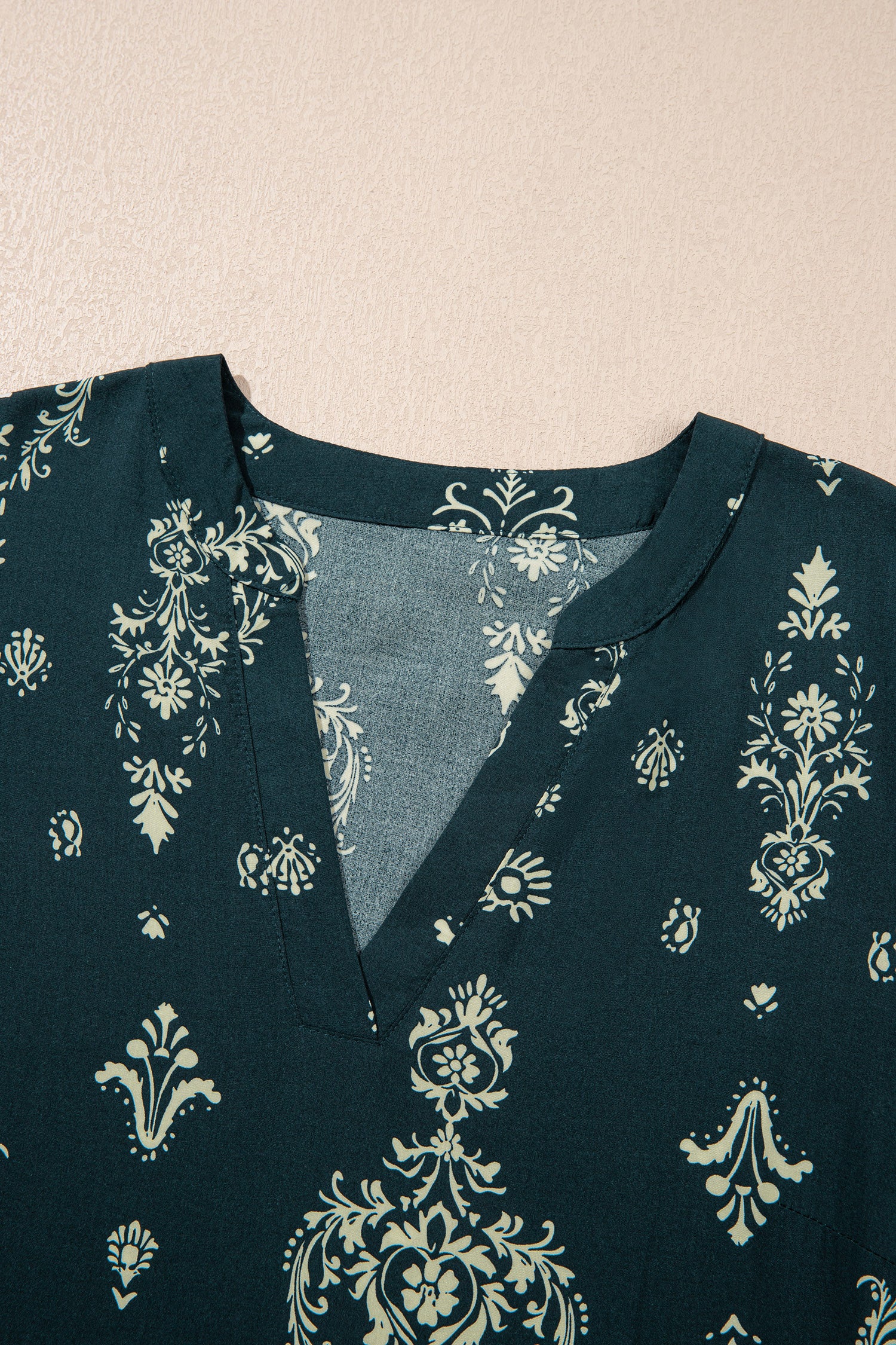 It has a v neckline, loose 3/4 sleeves, and a mini length.